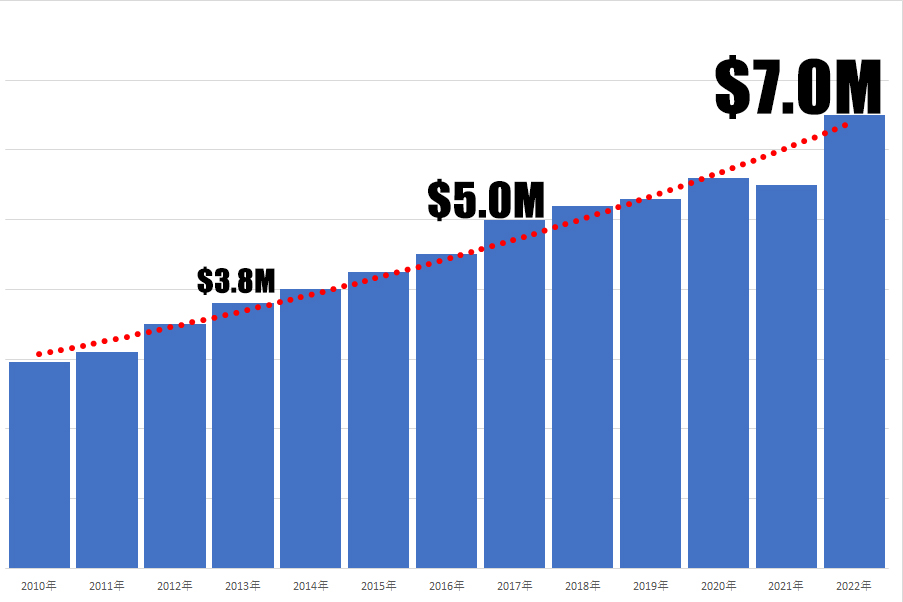 この10年を見ると、$4Mレンジ、$5Mレンジ時代があります。昨年2022年$6.5Mとバコンと跳ね上がってます。流れ的に$6Mのレンジを漂うはずでしたが、一気に$7Mにジャンプアップ。国内物価が急上昇している影響ですね。